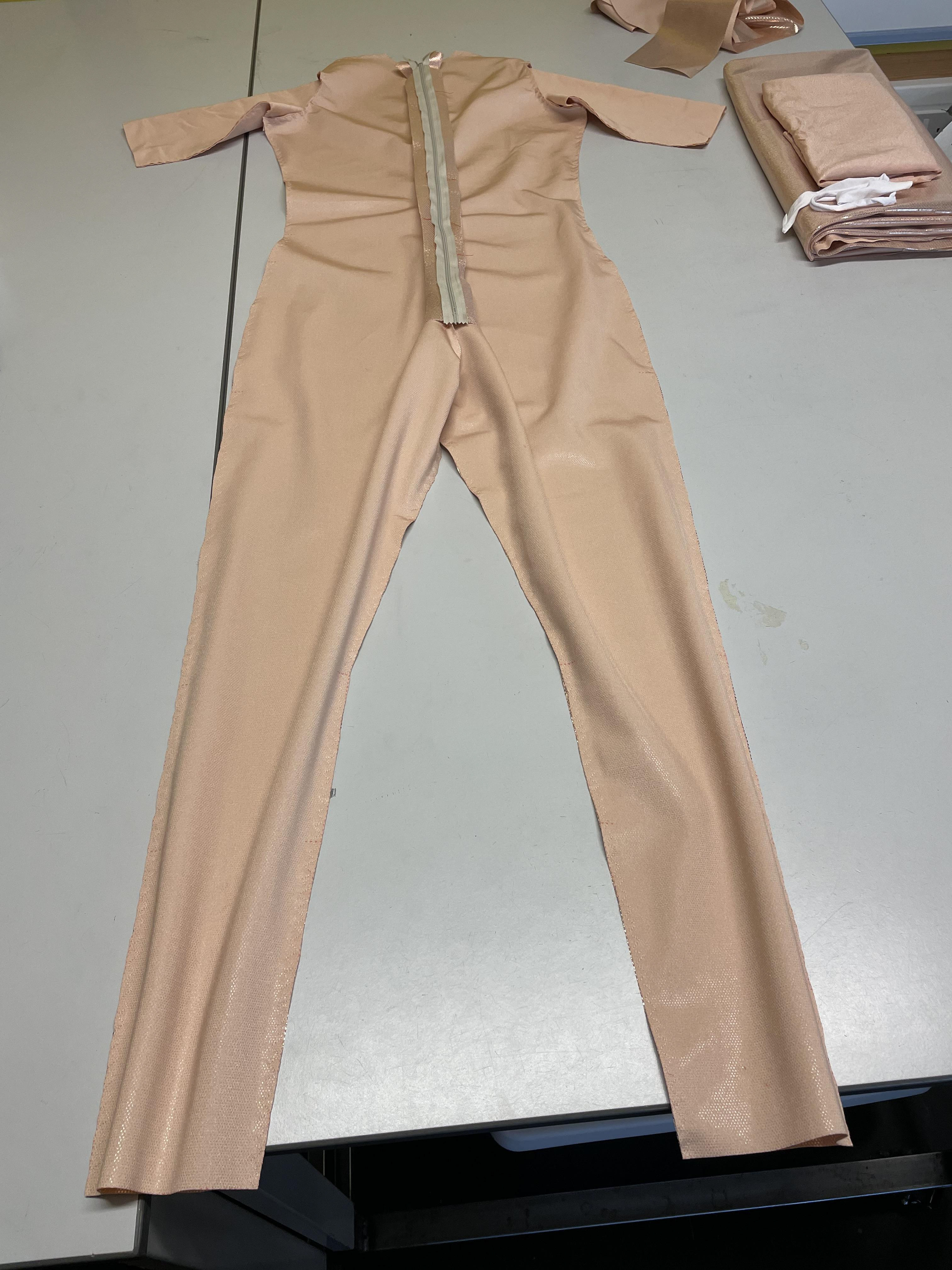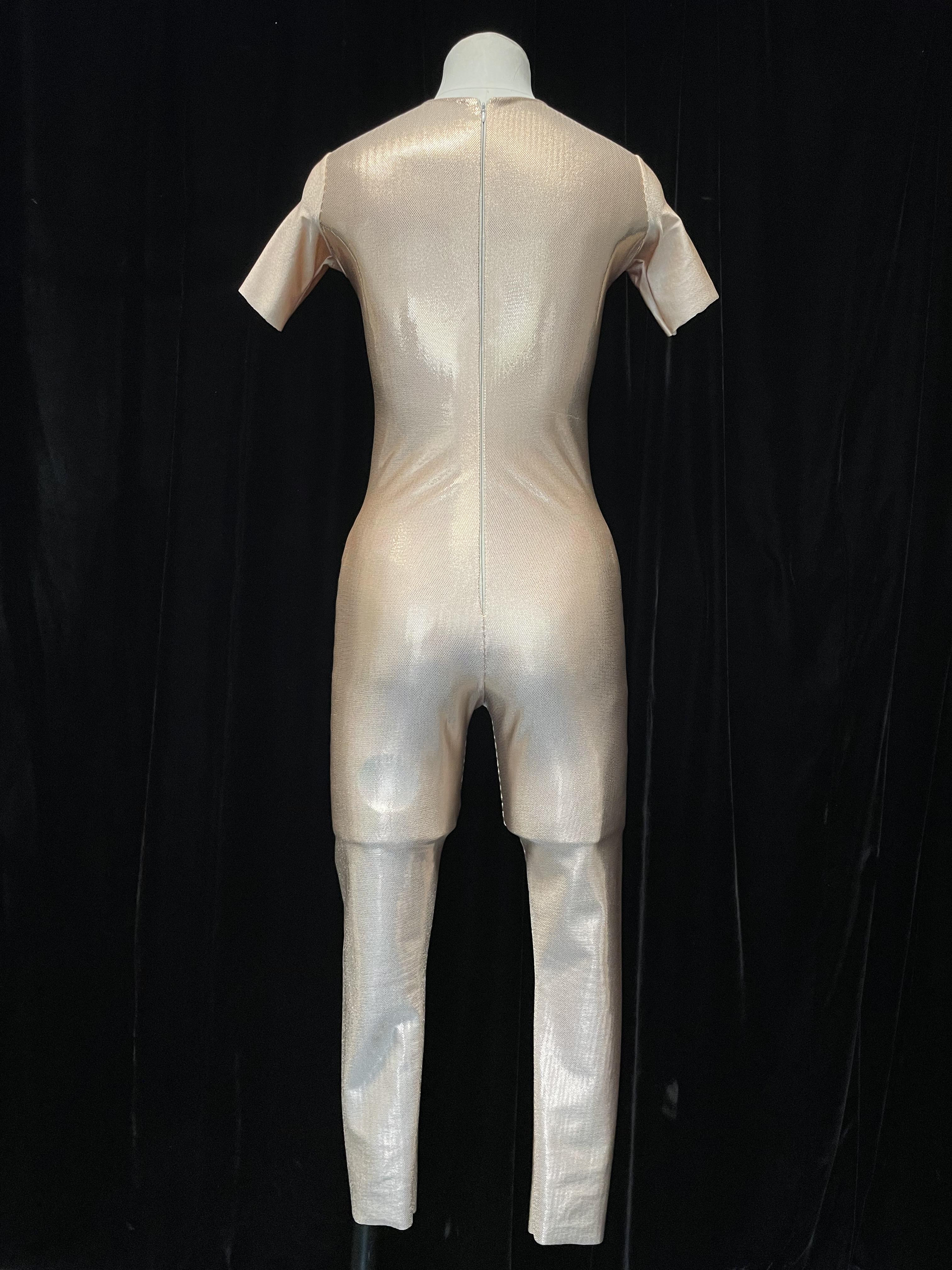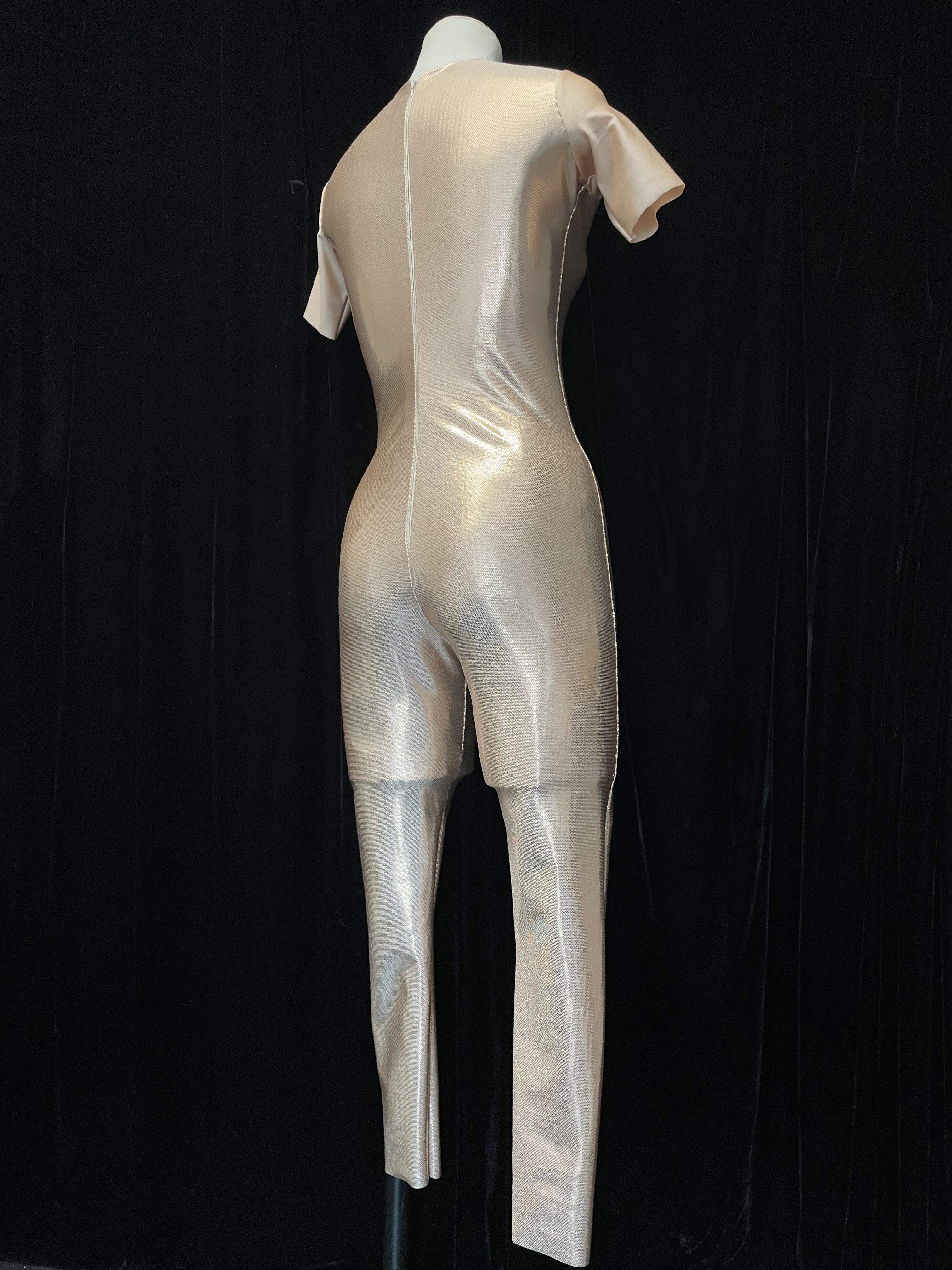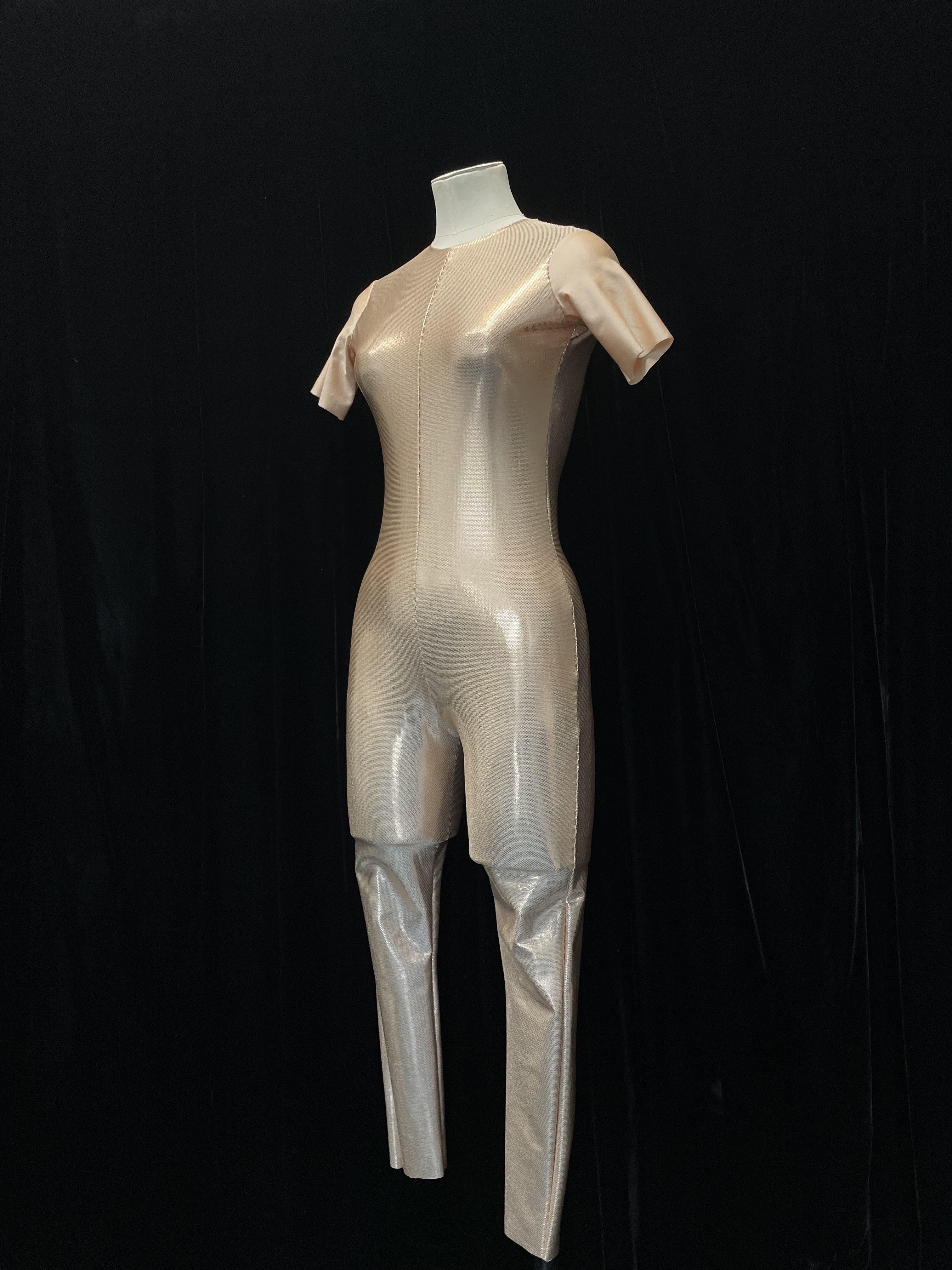 I flat-drafted and fit this short-sleeved catsuit while learning to use stretch fabrics, an industrial overlocker, elasticator, and cover stitch machine. Made from foiled lycra.