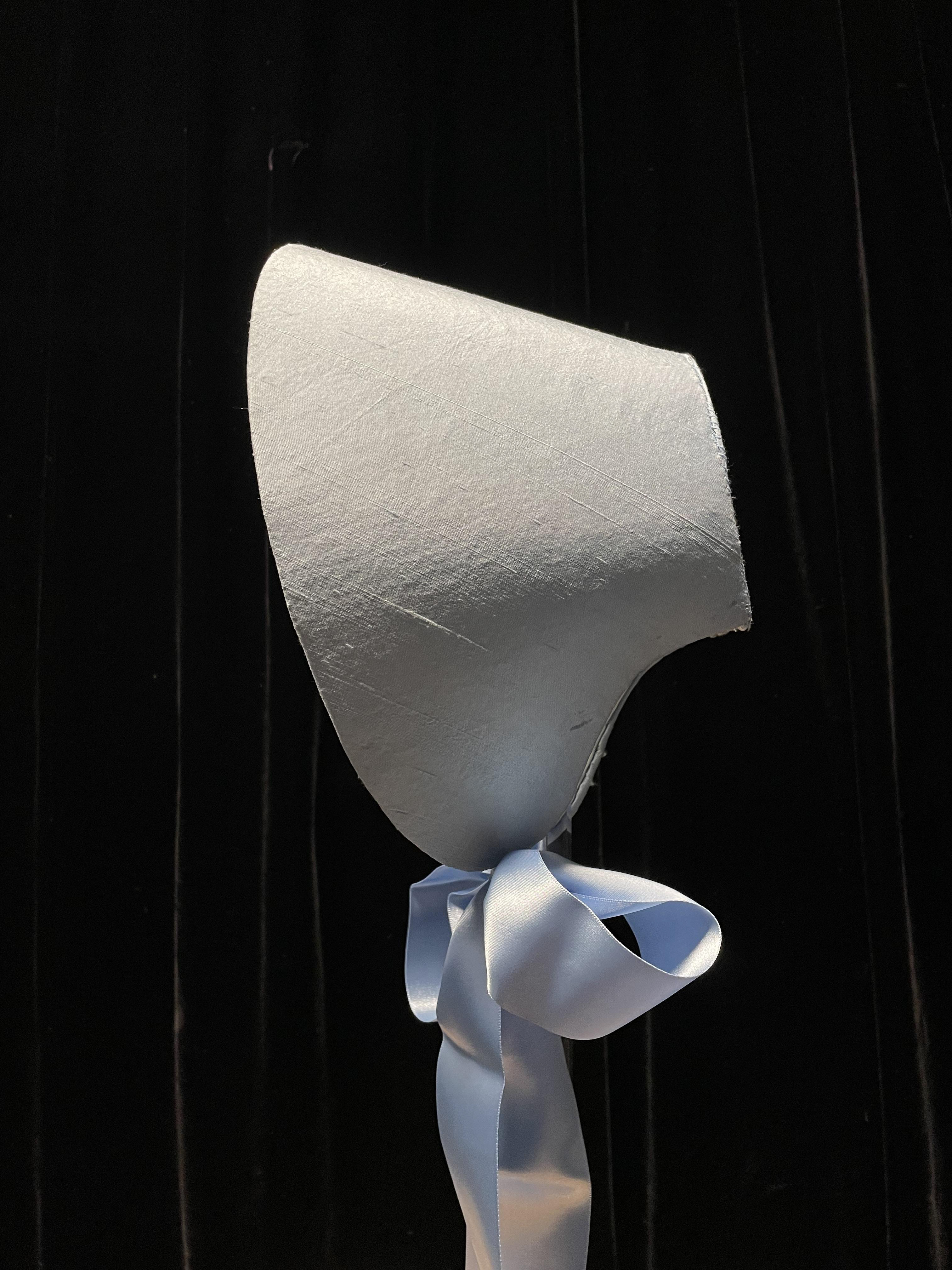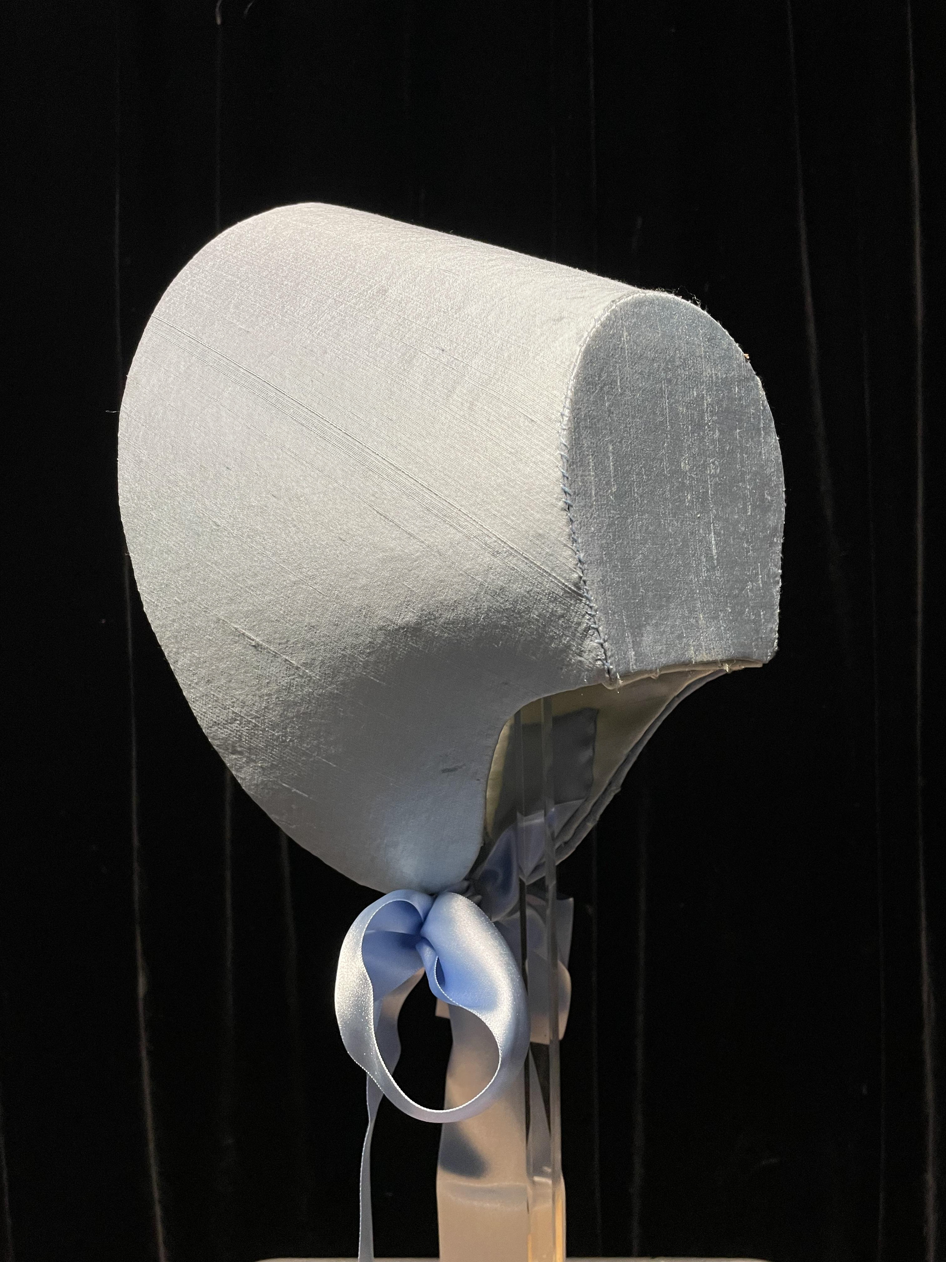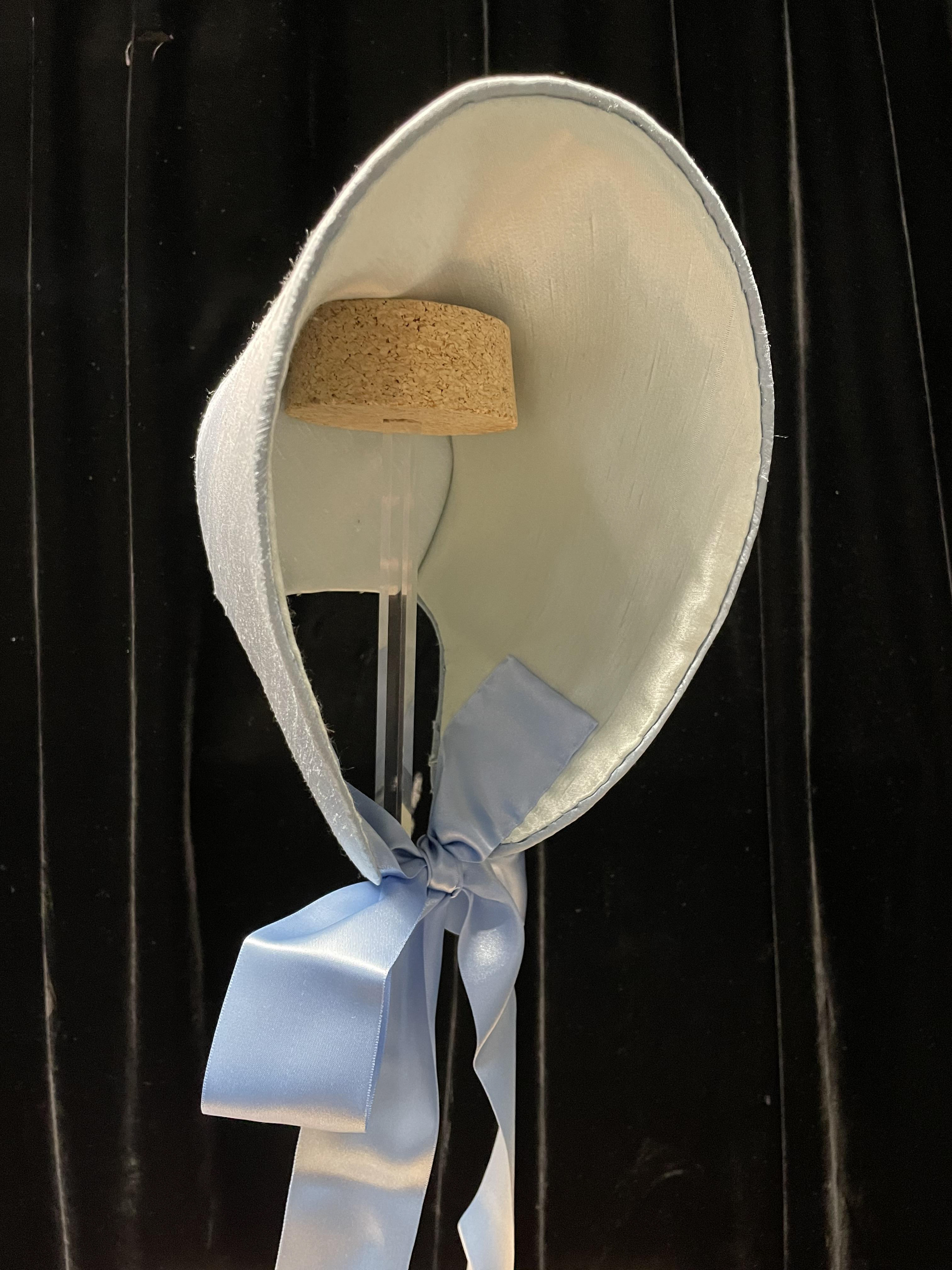 I made this hat from a given pattern by molding and sewing millinery wire to buckram and securing the fabric-covered pieces with industrial glue and hand-stitching. Made from buckram, silk dupion, satin, and satin ribbon.