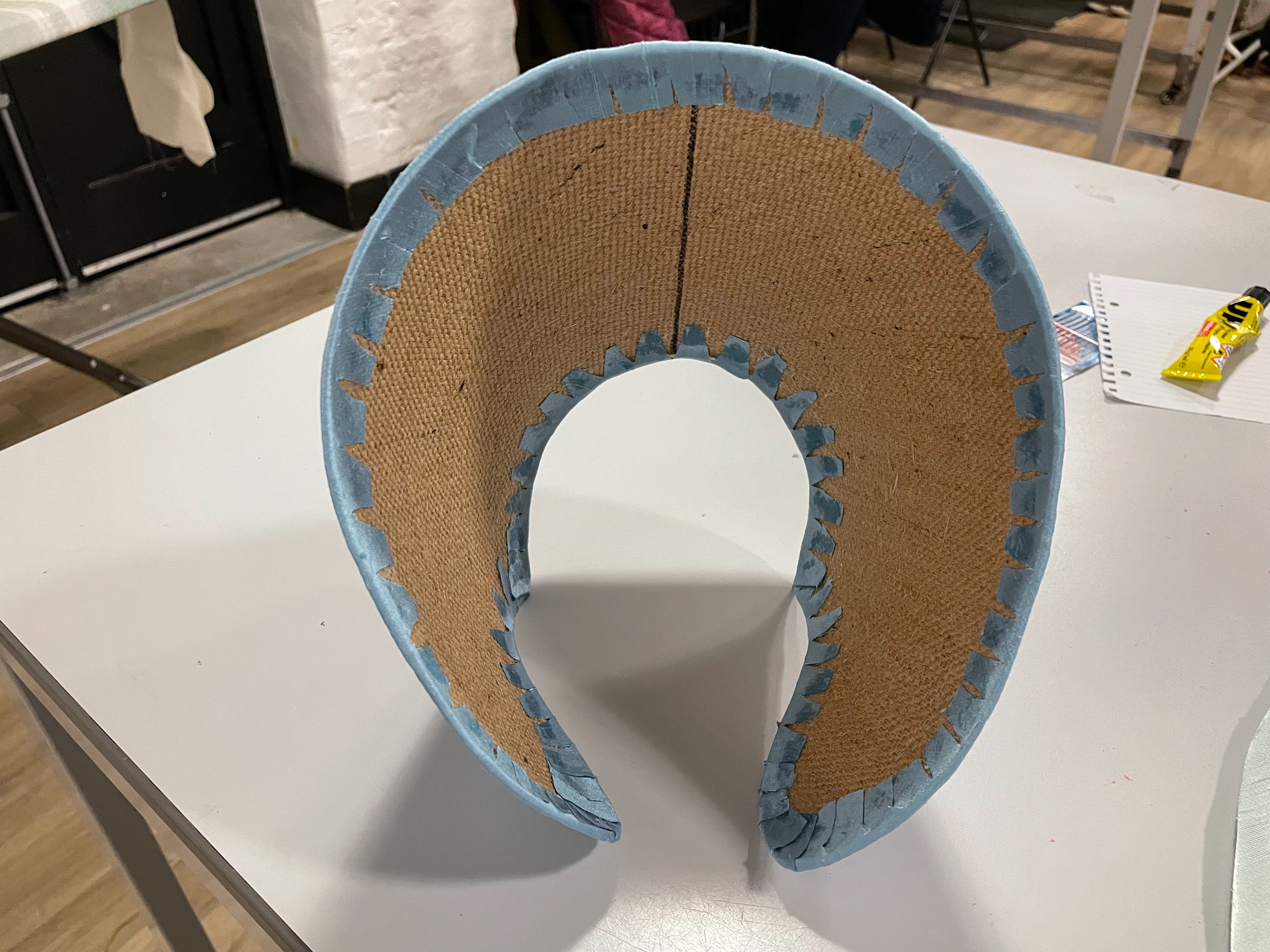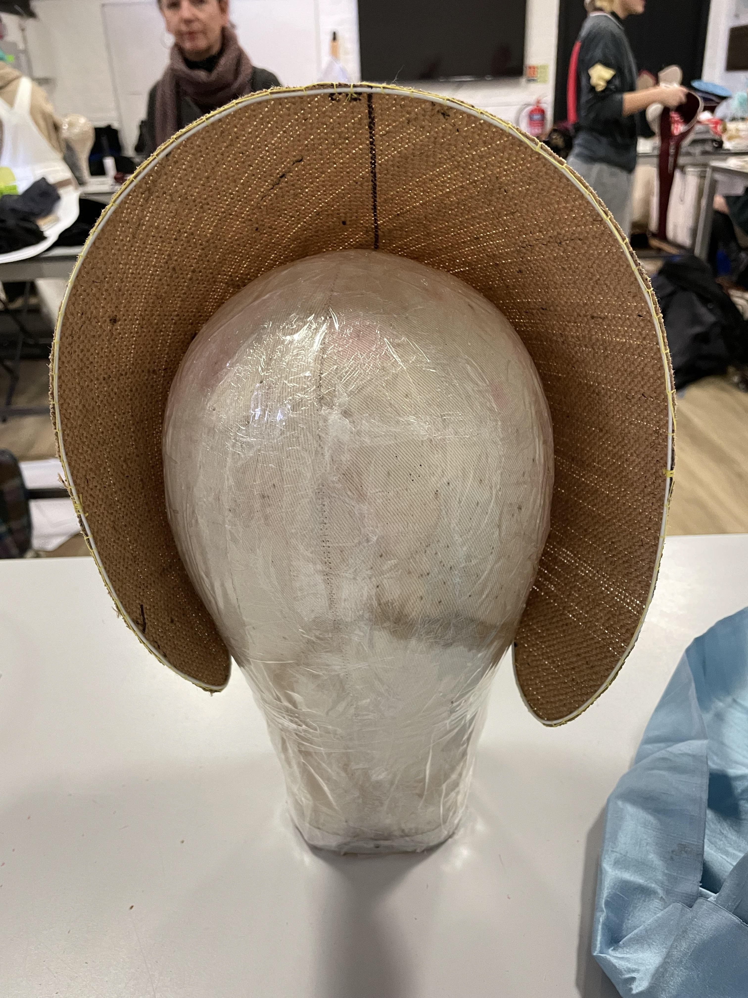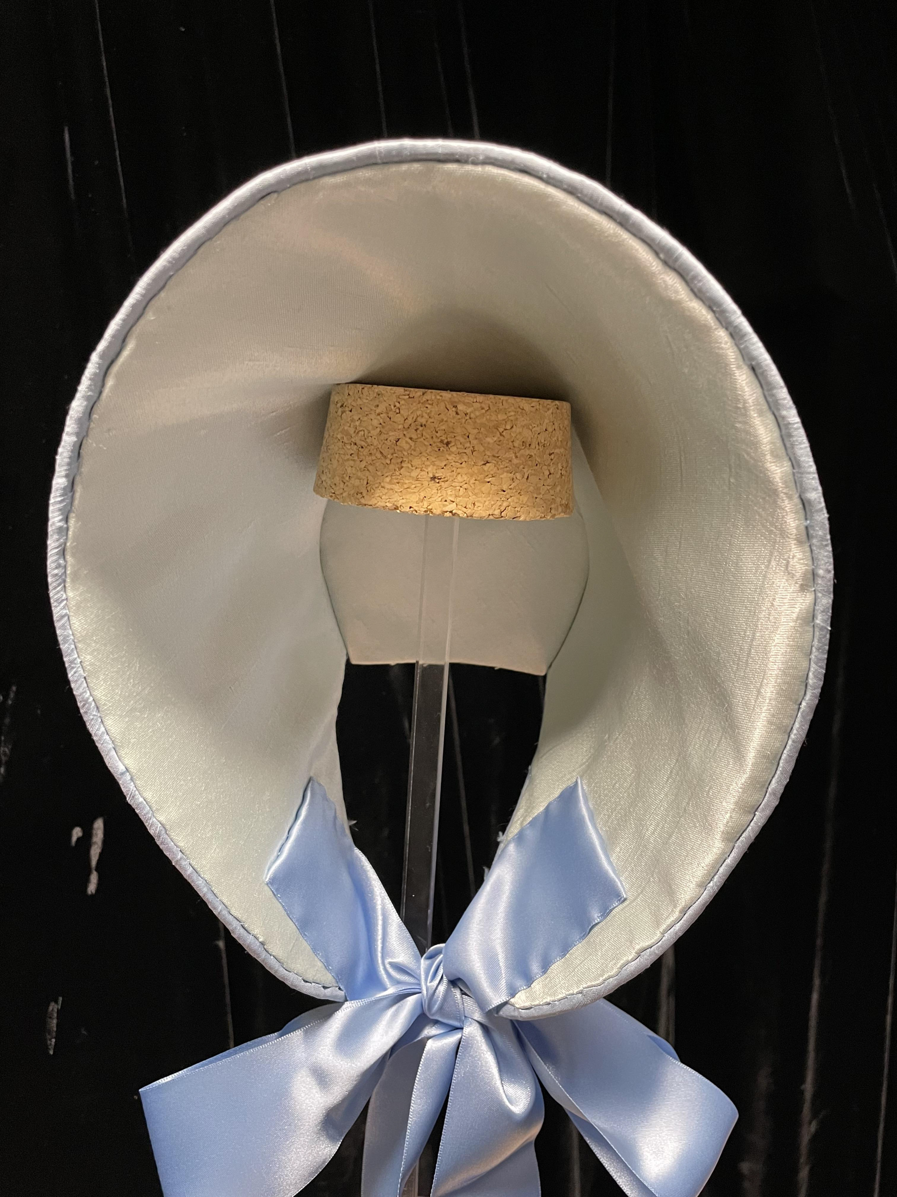 I made this hat from a given pattern by molding and sewing millinery wire to buckram and securing the fabric-covered pieces with industrial glue and hand-stitching. Made from buckram, silk dupion, satin, and satin ribbon.